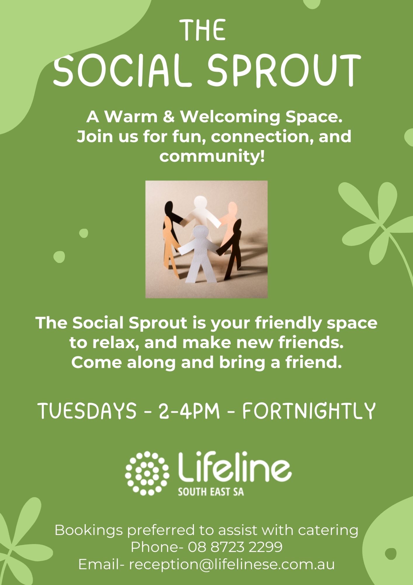 Join us for fun, connection, and community! The Social Sprout is your friendly space to relax, and make new friends. Come along and bring a friend. Tuesdays, 2-4PM, fortnightly.